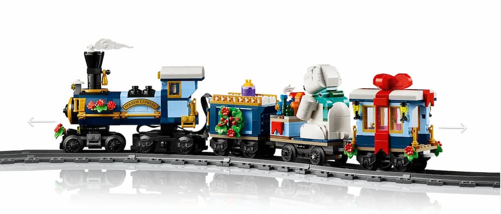 Der Zug selbst sieht fantastisch aus: eine festliche rote Lokomotive mit einem grünen Tender und natürlich mehreren Waggons. Während ich die genauen Maße des fertigen Modells noch nicht kenne, verspricht die Teilezahl ein ansprechend großes und detailreiches Modell, das perfekt auf die Schienen der LEGO-Eisenbahn passt (kreisrunde Bahnstrecke aus 16 Segmenten enthalten).